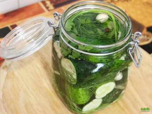 - 1 кг огурцов, - укроп, - головка чеснока, - 2-4 ст. л. соли, - 1 литр солёной газированной минералки.