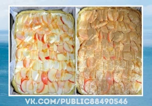 Равномерно выкладываем яблочные дольки поверх творожного слоя, обсыпаем корицей.