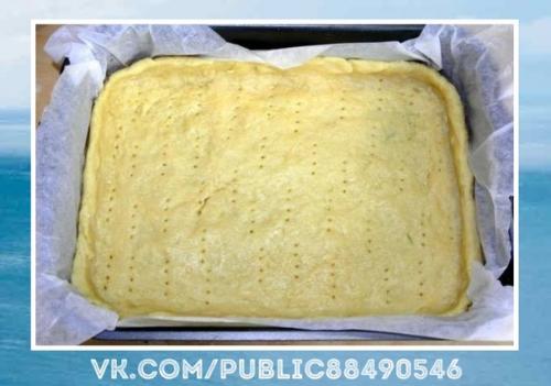 Распределяем тесто по форме, делаем невысокие бортики, прокалываем вилкой.