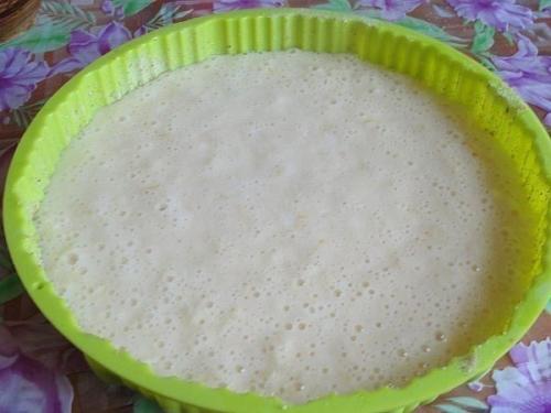 Форму для пирога выстелем пергаментной бумагой, смажем маслом, присыплем сухарями. Силиконовую форму достаточно просто смазать топлёным маслом или сливочным маргарином. Выльем тесто в форму для пирога.