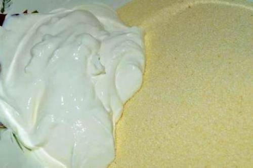 Шаг 1. манную крупу заливаем стаканом сметаны, перемешиваем и мы оставляем набухать на час.