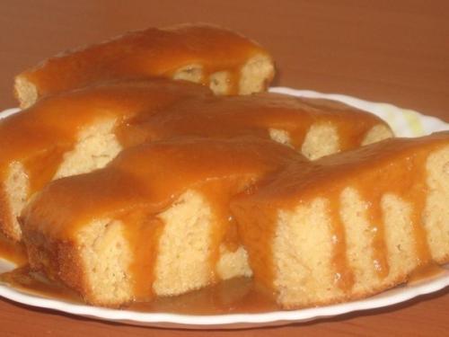 Готовый манник разрезать на порционные кусочки и полить горячим соусом.