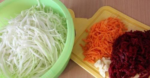 Капусту тонко нашинковать. Морковь и свёклу очистить и натереть на крупной тёрке. Чеснок почистить и нарезать на тонкие лепестки. Соединить капусту, свёклу, морковь и чеснок, всё хорошо перемешать. Выложить овощи в банку. Я использовала большую банку, но можно разложить овощную смесь по небольшим банкам. Приготовить маринад: воду влить в кастрюлю, добавить сахар, соль, лавровый лист и перец. Поставить кастрюлю на огонь и довести до кипения.