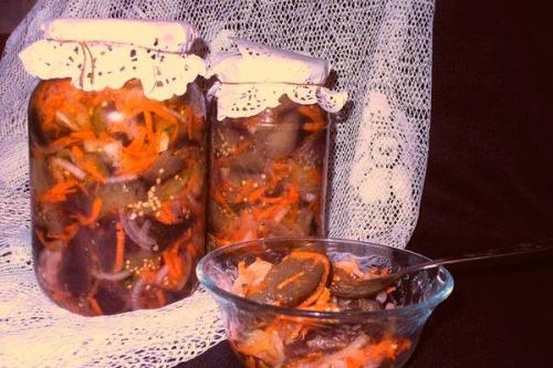 7 кг баклажан, 1 кг репчатого лука, 0, 5 кг моркови, 0, 3 кг чеснока, 0, 5 л уксуса (9%), 0, 5 л растительного масла.