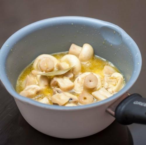 2. в кастрюльке, где будете варить грибы, приготовить маринад - смешать уксус, масло, сахар, соль, добавить перец горошком и лавровый лист.