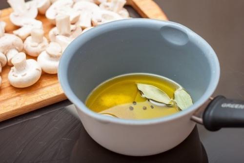 2. в кастрюльке, где будете варить грибы, приготовить маринад - смешать уксус, масло, сахар, соль, добавить перец горошком и лавровый лист.