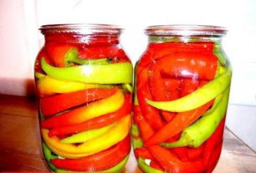 2. затем уложим перец в баночки, чередуя красный с зелёным.