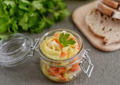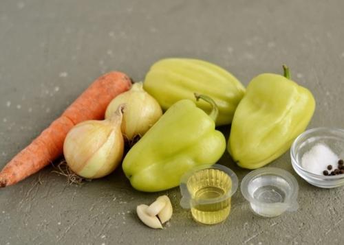 Мы подготовим все ингредиенты. Морковь нарежем соломкой, лук и перец полукольцами. Чеснок раздавим. Вскипятим в кастрюле воду, добавим перец горошком, соль, сахар, растительное масло и уксус. Проварим смесь пару минут. Плотно набиваем овощами банки, заливаем маринадом и закроем крышкой. Перевернем банку вниз крышкой и оставим на 8-12 часов. Маринованный перец с морковью готов, приятного аппетита!