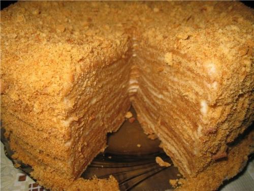 Яйца с сахаром (в стационарном миксере) мы взбиваем в пышную белую массу. Пока взбиваются яйца, занимаемся медом: помещаем в кастрюльку мед с содой, и при постоянном помешивании (2 - 3 мин) на среднем огне доводим медово - содовую смесь до красивого янтарного цвета. Убираем кастрюльку с плиты (за это время яйца с сахаром уже хорошо взбились) и вмешиваем горячий мед (по одной ложке) в взбитые с сахаром яйца, постоянно размешивая, чтобы яйца не свернулись.