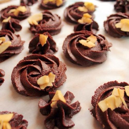 Масло и сахар миксером 5-10 мин взбивать. До растворения сахара, добавить яйца и взбить. Просеять муку и какао, взбить. Растопить шоколад на водяной бане. Добавить в тесто взбить. Переложить тесто в кондитерский мешок и отсадить печеньки на пергамент. Выпекать при 220 градусах 10-15 минут