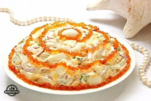 1. морской салат с креветками, кальмарами, икрой и крабовыми палочками.