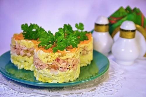 2. слоеный салат с шампиньонами, копченой курицей и корейской морковью.