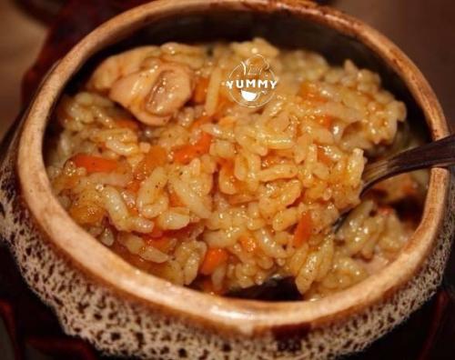 4. добавить воды столько, чтобы её уровень был на 1, 5 - 2 см выше риса. Посолить, закрыть горшочки крышками и поставить в заранее разогретую духовку. Сытно, ароматно, кушать так приятно?