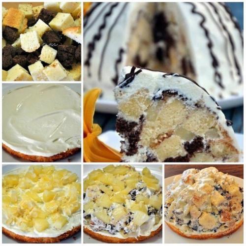 Выпекать бисквит в заранее разогретой до 180*с духовке до готовности. Готовность проверить деревянной шпажкой, она должна быть сухой. Готовый бисквит на решетке остудить. Как только бисквит остынет. Белый бисквит делим на три равные части. Остальные две части, и шоколадный бисквит режем на довольно крупные кубики. Готовим крем. Для этого взбить сливки с сахарной пудрой до состояния густоты, не перевзбейте, знайте меру, т. к сливки могут превратиться в сливочное масло. Добавить к сливкам сметану, и взбить до однородности. Ананасы из банки нарезать на средние кусочки, или взять уже нарезанный ананас.