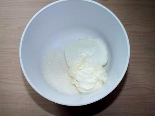 3. в чашке смешиваем творог, сахар и сметану, взбиваем блендером.