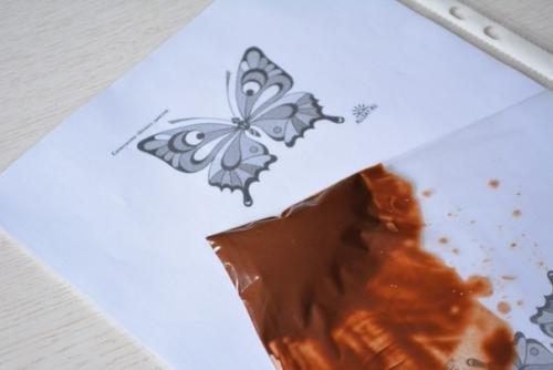 Растопленный шоколад подвигаем к уголку пакета, срезаем маааленький кончик и рисуем крылья бабочки (только крылья) на файлике по трафарету.