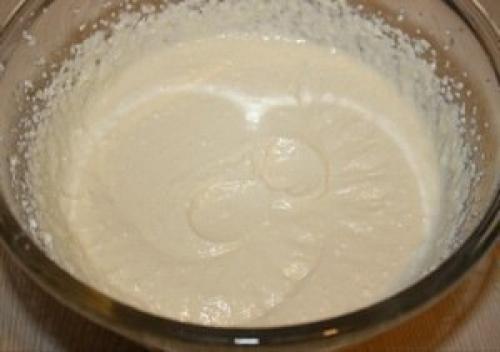 2. тем временем готовим начинку. Творог протираем через сито, добавляем сметану, яйца и сахар, взбиваем миксером до однородности.