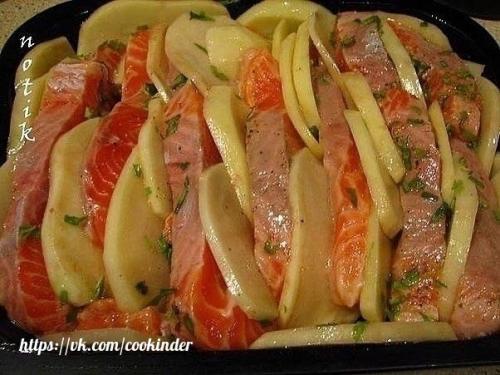 5. распределите всё на противне с кусками лосося, стараясь, чтобы картофель был снизу.