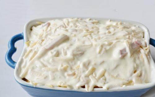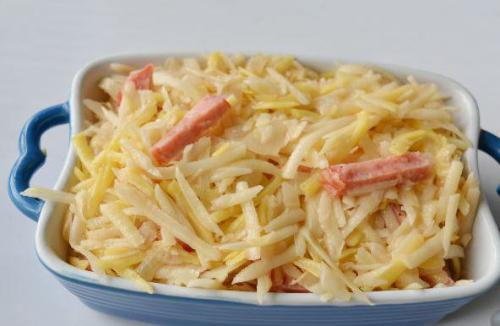 Выложите картошку с луком и колбасой в форму. (Можно готовить это блюдо из картофеля в порционных керамических горшочках. Сверху смажьте сметаной.