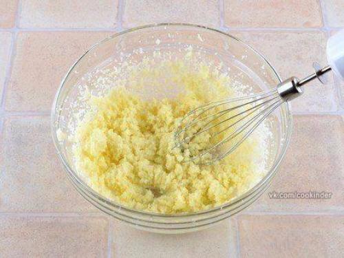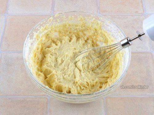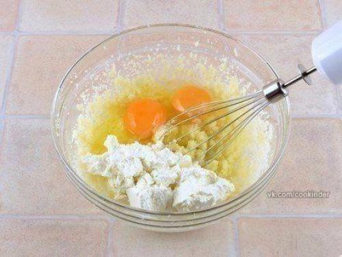 Мягкое сливочное масло взбить и сахар немного. Добавить творог, яйца, хорошо взбить до однородности.