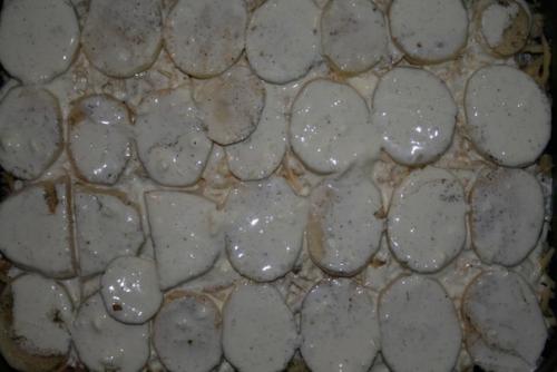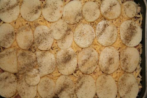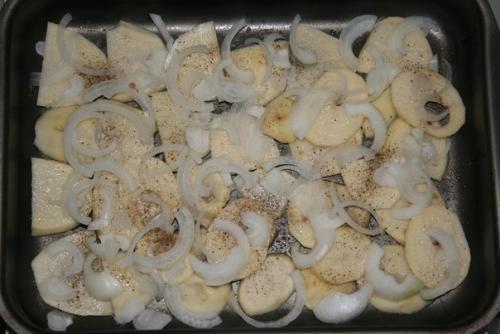 В смазанную маслом форму для запекания выложить половину картофеля, посолить, поперчить и сверху выложить лук.