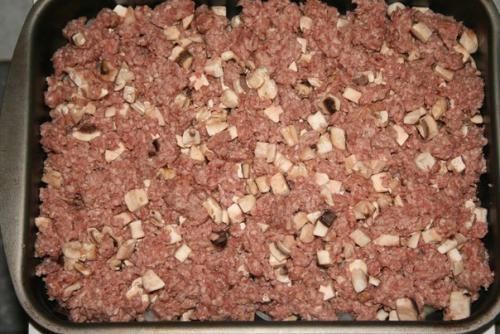 Приготовление: картофель очистить и нарезать тонкими ломтиками. Лук полукольцами порезать. Грибы порезать небольшими кубиками, смешать с фаршем и приправить солью и перцем.