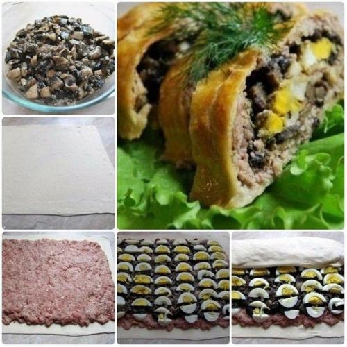 Мясной рулет с грибами в слоеном тесте.