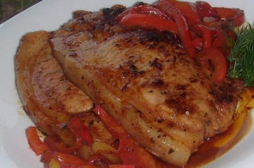 4. на хорошо нагретую сковородку уложить мясо, прожарить в течении 10 минут (на сильном огне. Мясо перевернуть, рядом уложить перец и чеснок, накрыть крышкой. Огонь убавить немного. Потомить - 20 минут.