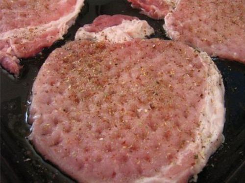 1. нарезанное кусочками мясо отбиваем через пленку и мы выкладываем на смазанный маслом противень. Добавляем соль и специи.
