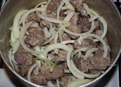 Мясо режем на небольшие кусочки и мы обжариваем на растительном масле до золотистого цвета.