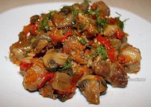 Мясо, тушеное с шампиньонами и сладким перцем.