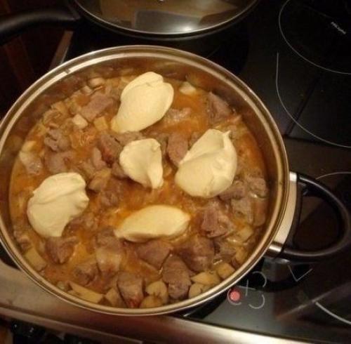 А потом кромсаем их на мелкие части. Порезанные грибы высыпаем в мясо, которое уже неплохо обжарилось (нет кроваво - красных пятен, зато есть ароматно кипящий бульон), добавляем приправу и перемешиваем. Добавляем добрую ложку томатной пасты и ещё раз перемешиваем. Дальше выкладываем плавленый сыр и очень тщательно его размешиваем - расплавляем, чем дольше и тщательней - тем лучше.