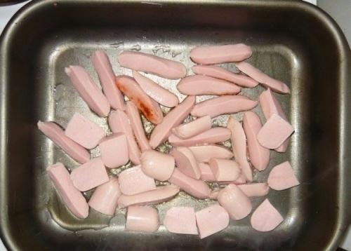 2. капусту режем мелкими кубиками. На сковороде или прямо на противне обжариваем разрезанные на дольки сосиски. Затем выкладываем капусту.
