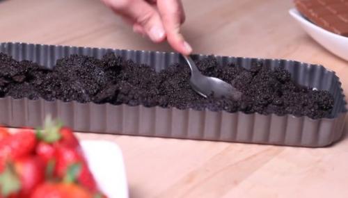 Заполни массой из печенья и масла форму, сделай основу для торта. Помести блюдо в холодильник, пусть масса застывает, пока ты займешься следующими приготовлениями.