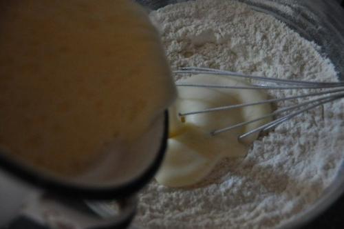 2. яйцо взбить в пену (примерно 3 минуты. Добавить молоко и перемешать. Добавить эту смесь в сухие ингредиенты и аккуратно перемешать.