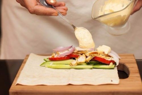 7. лаваш нарезать прямоугольниками 20 х 30 см. Выложить на лаваш огурцы, помидоры куриное мясо, лук и полить соусом. Завернуть конвертом. Быстро обжарить на сковороде - гриль. Разрезать на 2 части под углом и подавать к столу! Приятного аппетита!