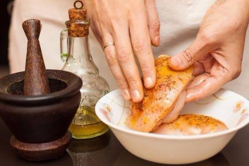 1. Филе куриной грудки натереть измельченными специями и растительным маслом, оставить мариноваться на час.