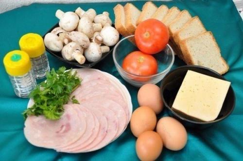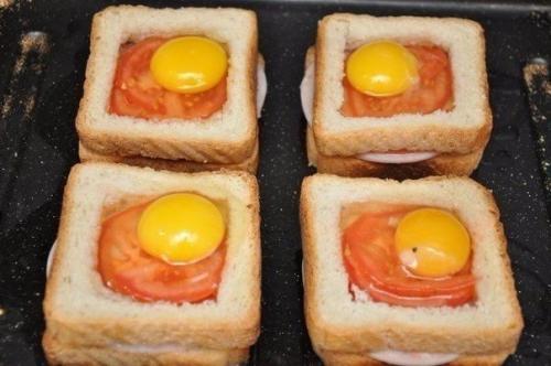 2. на остальные 4 кусочка хлеба положить по 2 пластинки ветчины, на них - оставшиеся 4 хлебных "Ободка" без мякиша. Внутрь ободков положить нарезанные кружочки помидоров и разбить в каждый бутерброд по яйцу. Посолить, поперчить.