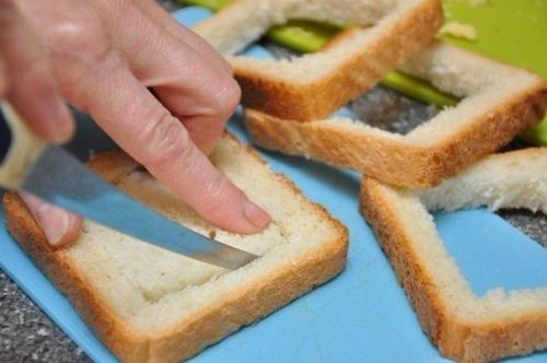 1. из 8 кусков хлеба острым ножом вырезать мякиш. Получатся хлебные "Ободки" из корочек. 8. Целых кусочков хлеба выложить на противень, на 4 из них положить хлебные "Ободки". Заполнить их заранее обжаренными грибами, посолить, поперчить и посыпать тертым сыром.