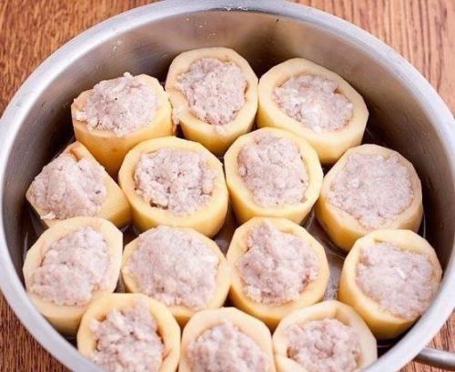1. мы подбираем картошку одинакового размера. Вырезаем из нее серединку (это можно сделать используя нож и чайную ложку. Донышко картофелин немного срезаем, чтобы они были устойчивы в сковородке (или сотейнике.