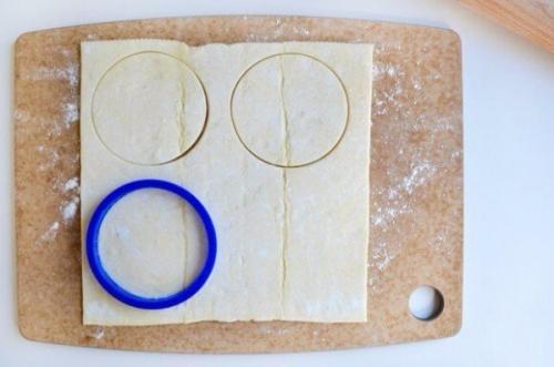 Разморозьте тесто. Разогрейте духовку до 200 градусов. Посыпьте мукой рабочую поверхность, разложите на ней тесто и слегка раскатайте. Выемкой (можете воспользоваться чашкой или стаканом) сделайте заготовки тарталеток. Разложите их на противне, застеленном пергаментом, на расстоянии 2 см друг от друга.