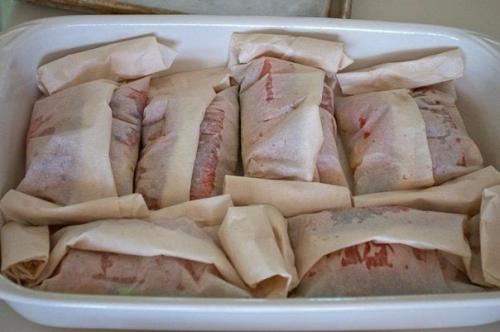 Выпекайте 10 минут пока пергамент не начнет коричневеть (что произойдет из-за оливкового масла. Достаньте из духовки и выложите по свертку на тарелку.?