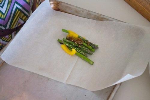 В середину листа выложите овощи (спаржа и болгарский перец. Сбрызните примерно 1 столовой ложкой маринада овощи, наверх выложите Филе лосося, его тоже залейте ложкой маринада.