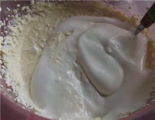 5. 1/3 белка аккуратно снизу вверх вмешиваем в тесто. Затем примешиваем остальной белок.
