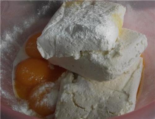 3. желтки, творог, разрыхлитель и ванилин взбить в однородную массу. По желанию можно добавить маленькую щепотку соли, я так и сделала.