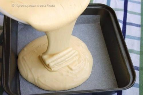 Добавить молоко. Взбивать на высокой скорости миксера в течение 3-х минут. Добавить молоко. Растительное масло, разрыхлитель, муку. Перемешать миксером до однородности. Вылить в форму 19 х 19 см, застеленную промасленной бумагой. Печь при 180 C 30 минут. Дать немного остыть. Перевернуть, снять бумагу.
