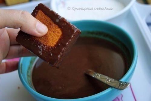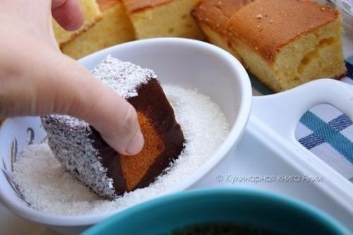 Молоко, сахар, какао и шоколад сложить в маленькую кастрюльку, довести до кипения. Остудить до комнатной температуры. Остывший бисквит разрезать на 16 кубиков. Края обрезать тонко. Мы обмакиваем 4 стороны в соус. Каждую сторону держите по 15 секунд или дольше, если хотите, чтобы лучше пропитались. Чуть-чуть дайте стечь и. обмакните с четырех сторон в кокосовую стружку. Поставьте на дно, а верхушку слегка смажьте соусом и присыпьте стружкой. И так все пирожные. Кушать можно сразу! Приятного аппетита!