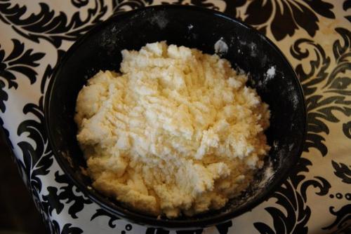 1. мы смешиваем творог, соль, сахар и муку. Творог не должен липнуть к рукам.