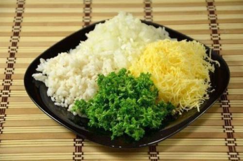 1. сыр натрите на мелкой терке, одну луковицу мелко порежьте, рис отварите до полуготовности, а зелень измельчите ножом.