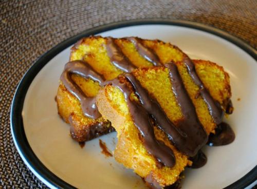 Добавляем остальные ингредиенты, хорошо перемешиваем и ставим на средний огонь. Варим несколько минут, постоянно помешивая, до загустения. Немного остужаем глазурь и поливаем ею кекс. Вот такой он, ярко-желтый и высокий!